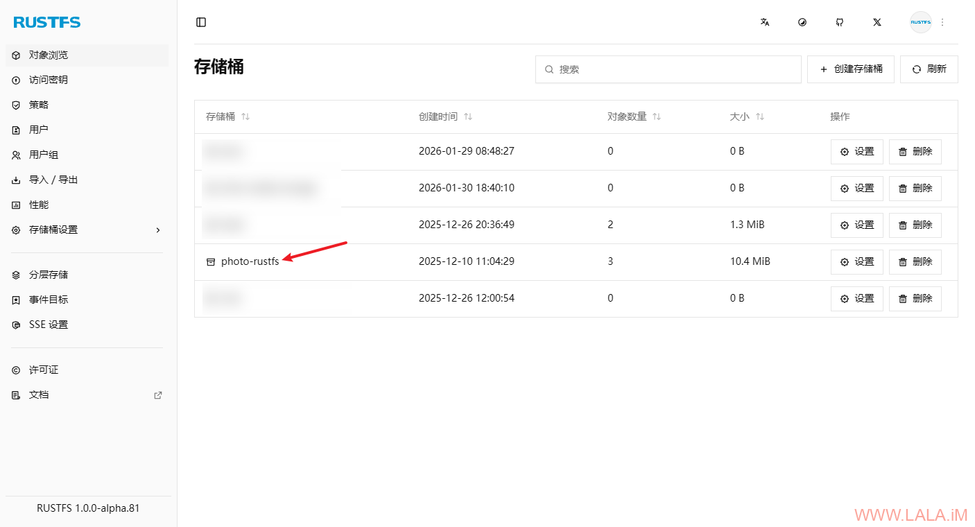 实战演示一下,在RustFS控制台创建一个桶,例如名字为:photo-rustfs